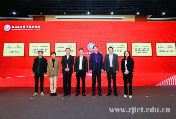 会上,举行了产业学院和基地揭牌仪式。学校与浙江省兴合集团有限责任公司共建兴合学院,与杭州西湖风景名胜区资产经营集团有限公司共建西湖景区文旅融创产业学院,与厦门网中网软件公司共建正保财金大数据产业学院,与浙江新大三源控股集团有限公司共建三源学院,与绍兴市上虞区供销合作总社、平湖市供销合作社联合社共建“大思政课”实践教学基地、合作经济实践教学基地和劳动教育实践基地。